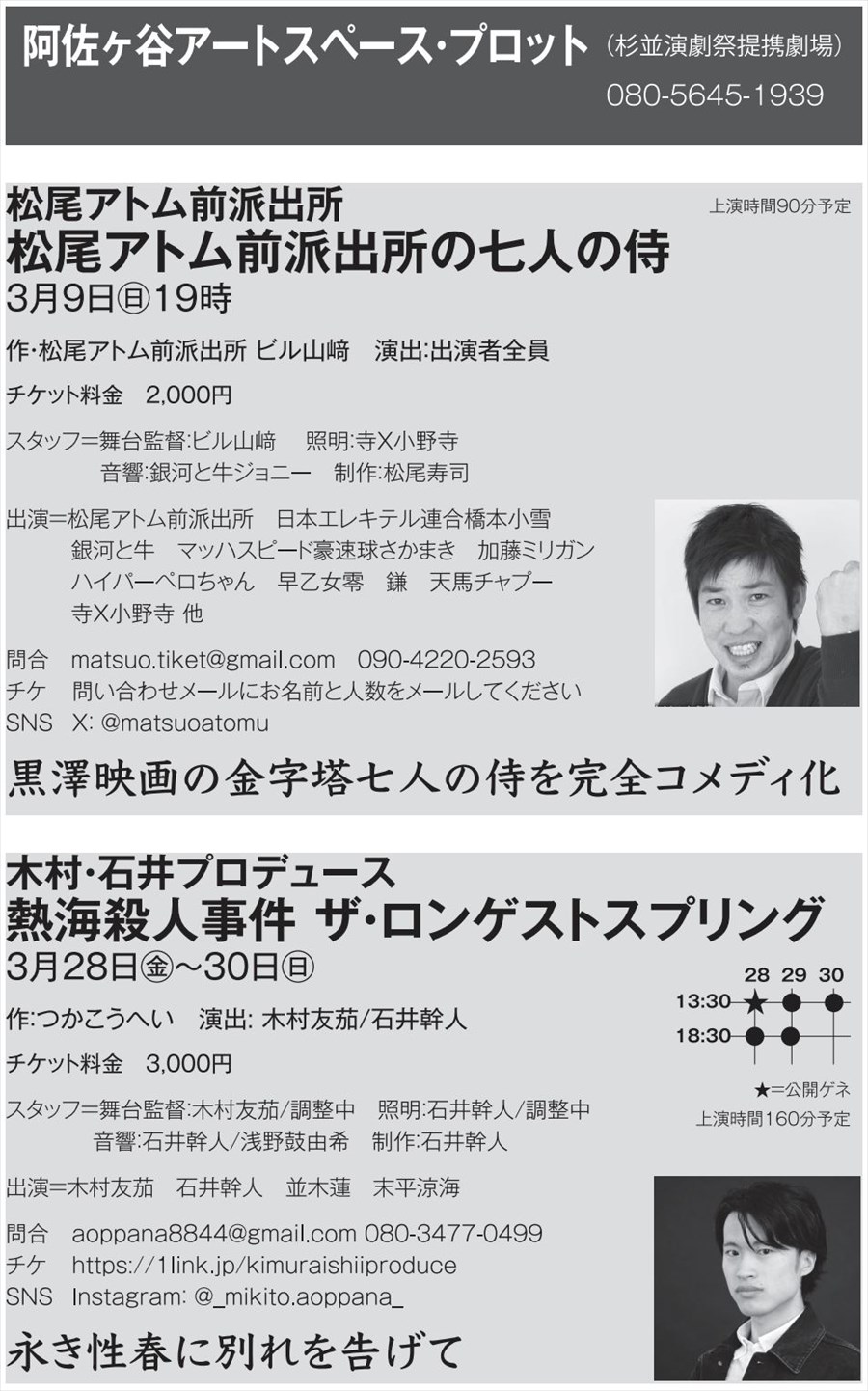 | 申込: | 参加を希望する団体及び個人は、参加申込書をダウンロードし、必要事項を記入して杉並演劇祭実行委員会に送信すること。(2024-11-30締切) (Email:engekisai@oregano.ocn.ne.jp FAX:03-5374-8897) |